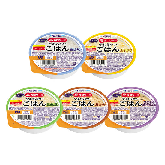 食べきりサイズでカロリーたっぷり1個あたり150kcal、たんぱく質7g。国産精米使用。ユニバーサルデザインフード「舌でつぶせる」に分類。
